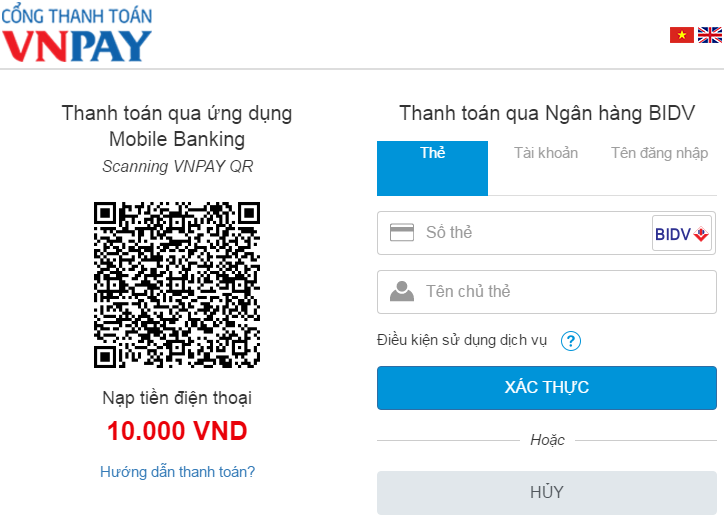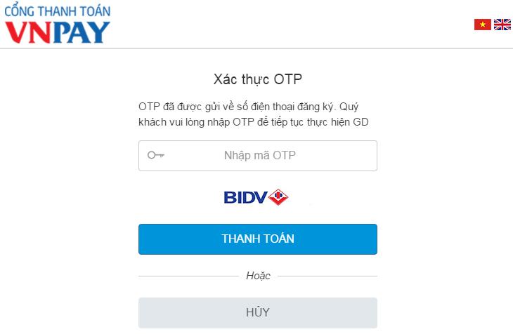 - Bấm "Xác thực" nếu vẫn muốn lựa chọn hình thức thanh toán này, bấm "Hủy" nếu muốn chuyển sang hình thức thanh toán khác.