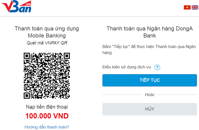 Sau khi lựa chọn sản phẩm, dịch vụ, quý khách chọn ngân hàng thanh toán là Đông Á, vban.vn sẽ chuyển quý khách sang cổng thanh toán VnPayment, tại đây: