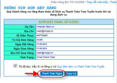 DongA sẽ cho quý khách kiểm tra lại đơn hàng. Nếu đơn hàng chính xác, quý khách bấm vào “Tôi đã đọc, hiểu rõ và đồng ý với Quy định dịch vụ Thanh Toán Trực Tuyến” và nhấn “Thanh Toán Ngay”