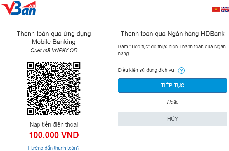 Bước 1: Sau khi lựa chọn sản phẩm, dịch vụ, quý khách chọn ngân hàng thanh toán là HDBank và nhấn vào nút “Tiếp tục”, vban.vn sẽ chuyển quý khách sang cổng thanh toán VnPayment, tại đây: