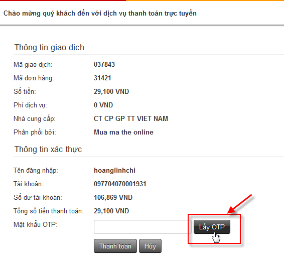 Bước 4: HDBank sẽ hiển thị lại thông tin liên quan đến nội dung thanh toán bao gồm thông tin giao dịch và thông tin xác thực. Nếu thông tin chính xác, Quý khách nhấn vào vào nút “Lấy OTP”. Sau khi nhập OTP được trả về từ máy điện thoại, nhấn “Thanh toán”.