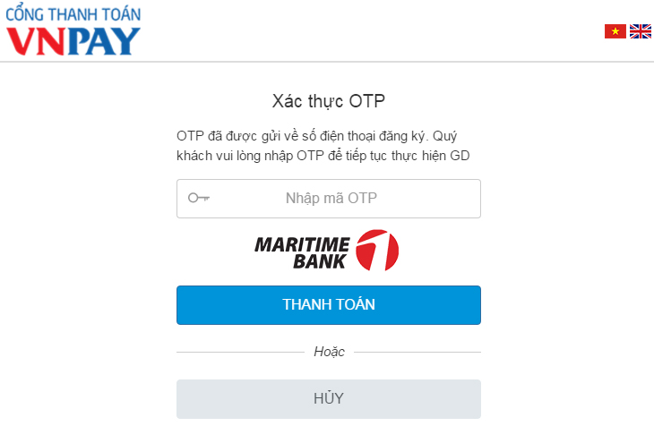 Bước 4: Nhập mã giao dịch đã được gửi tới số điện thoại khách hàng đã đăng ký với ngân hàng Maritime Bank để xác thực thanh toán