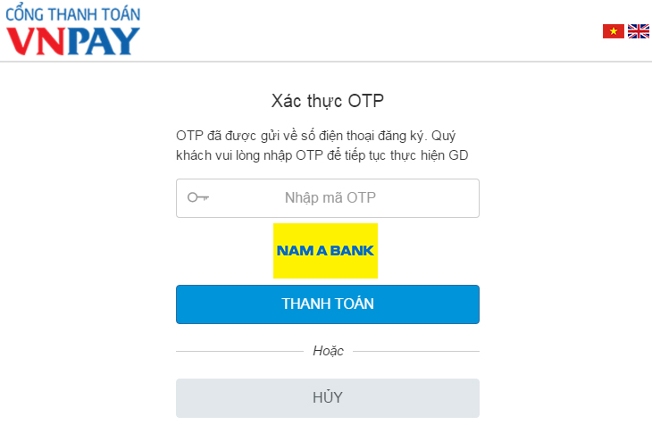Bước 5: Nhập mật khẩu OTP đã được gửi tới số điện thoại khách hàng đã đăng ký với ngân hàng Nam A Bank để xác thực thanh toán
