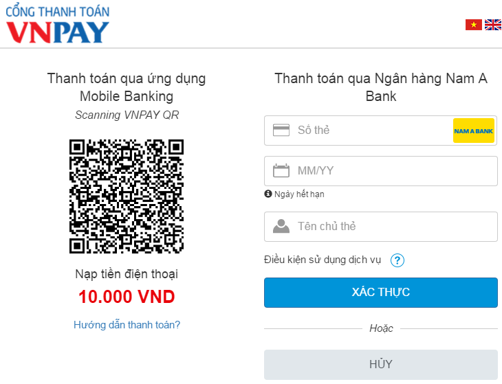 Quý khách xác nhận lại nội dung thanh toán và chọn ngân hàng thanh toán là Nam A Bank và nhấn nút “Thanh toán”.