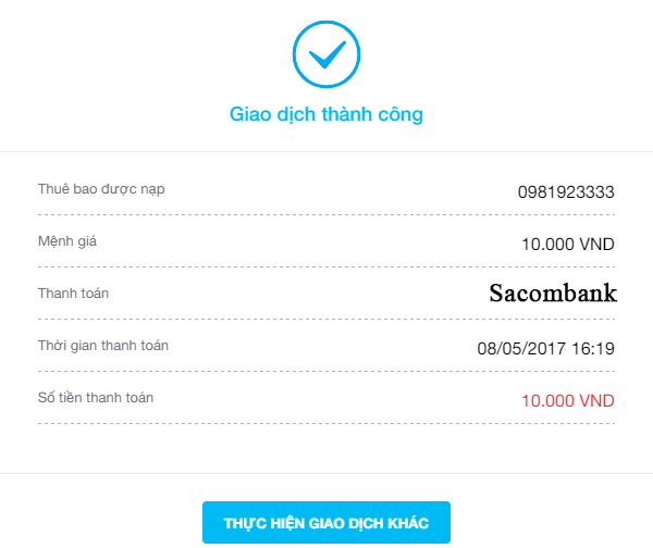Sau khi thanh toán thành công, Quý khách sẽ nhận được thông báo về kết quả cung cấp sản phẩm / dịch vụ: