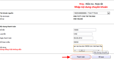 Techcombank sẽ hiển thị lại thông tin liên quan đến tài khoản nguồn và nội dung thanh toán để quý khách kiểm tra. Nếu thông tin chính xác, quý khách nhấn vào “Thanh Toán”.
