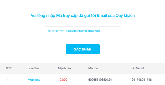 Quý khách đăng nhập vào địa chỉ email đã cung cấp ở Bước 1 để nhận đường link dẫn đến địa chỉ nhận mã thẻ và mật mã truy cập. Sau khi thực hiện thao tác, quý khách sẽ nhận được thông tin về mã thẻ đã mua.