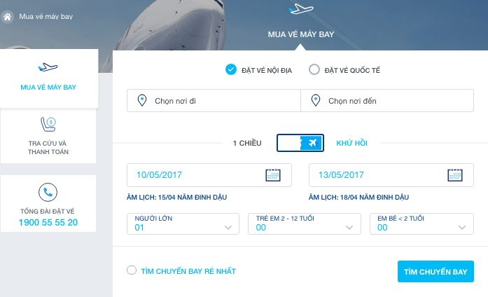 Trong cửa sổ đặt vé máy bay trực tuyến, vui lòng chọn hành trình quý khách mong muốn và ngày cần đi, số người và nhấn nút TÌM CHUYẾN BAY .