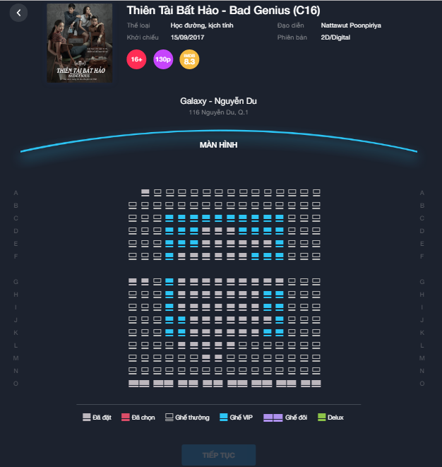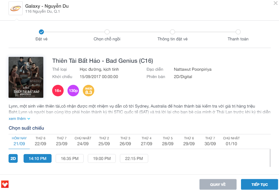 Bước 2: Lựa chọn suất chiếu phù hợp. Sau đó nhấn Tiếp tục