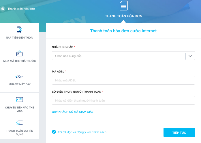 - Quý khách lựa chọn nhà cung cấp, nhập mã số khách hàng (mã số khách hàng Quý khách có thể xem trên hóa đơn Internet- ADSL hàng tháng).