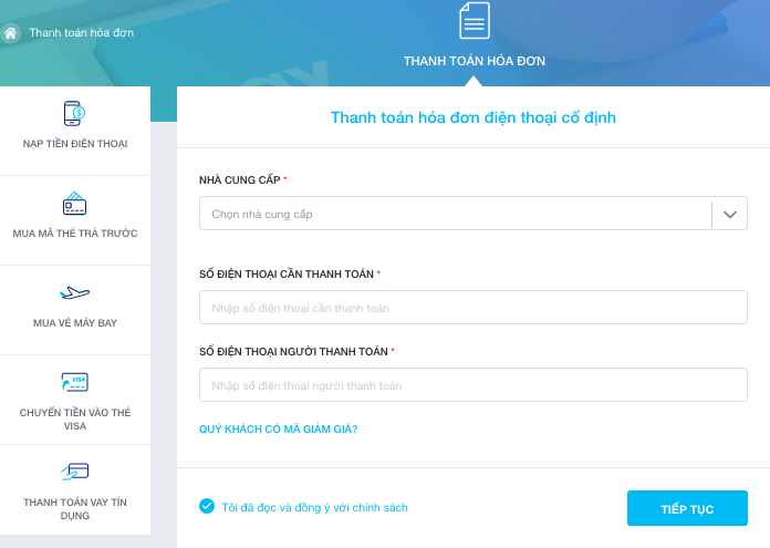 - Chọn nhà cung cấp và nhập số điện thoại cần thanh toán cước.