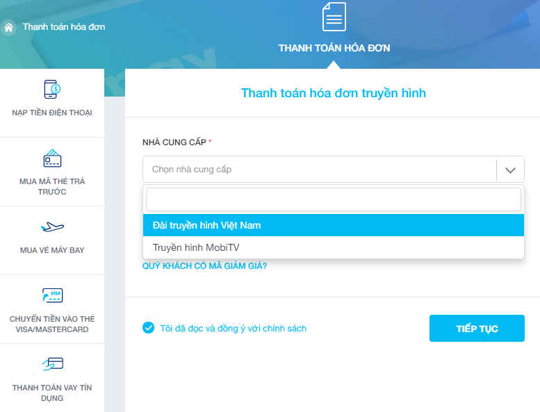 Bước 1: Quý khách truy cập vào website http://www.vban.vn và lựa chọn dịch vụ "Thanh toán hóa đơn" sau đó chọn tiếp "Hóa đơn truyền hình"